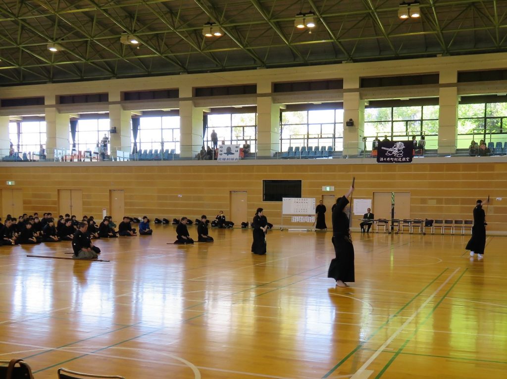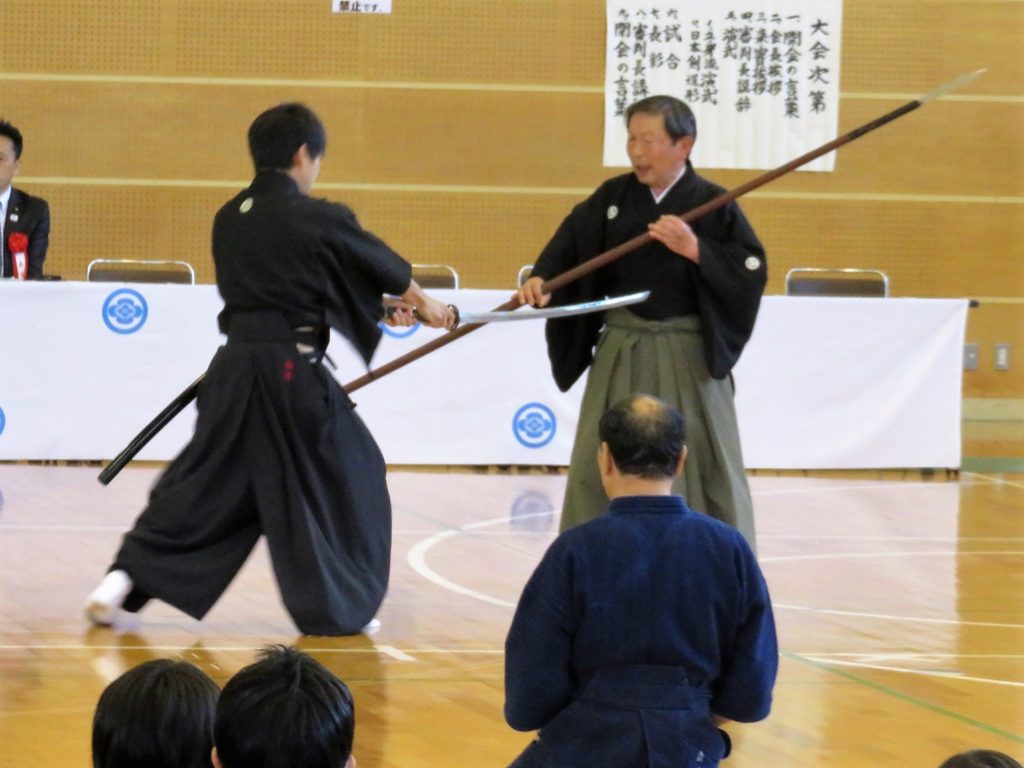 当日は師範と門人の7名で小・中・高の学生の前で居合、剣術、鎗の演武を披露してきました。