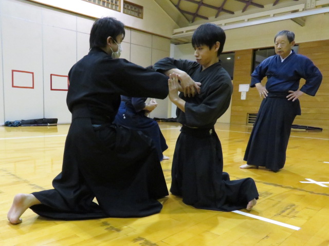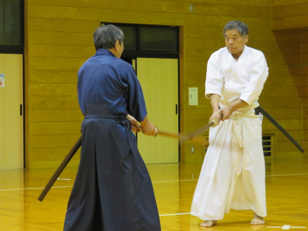 初日は居合の抜付・納刀をゆっくり正しく二人が向き合って、確認しながら行いました。この稽古方法は大変効果的であったと思います。剣術では同じ方法で、摺り上げ技の稽古を行いました。