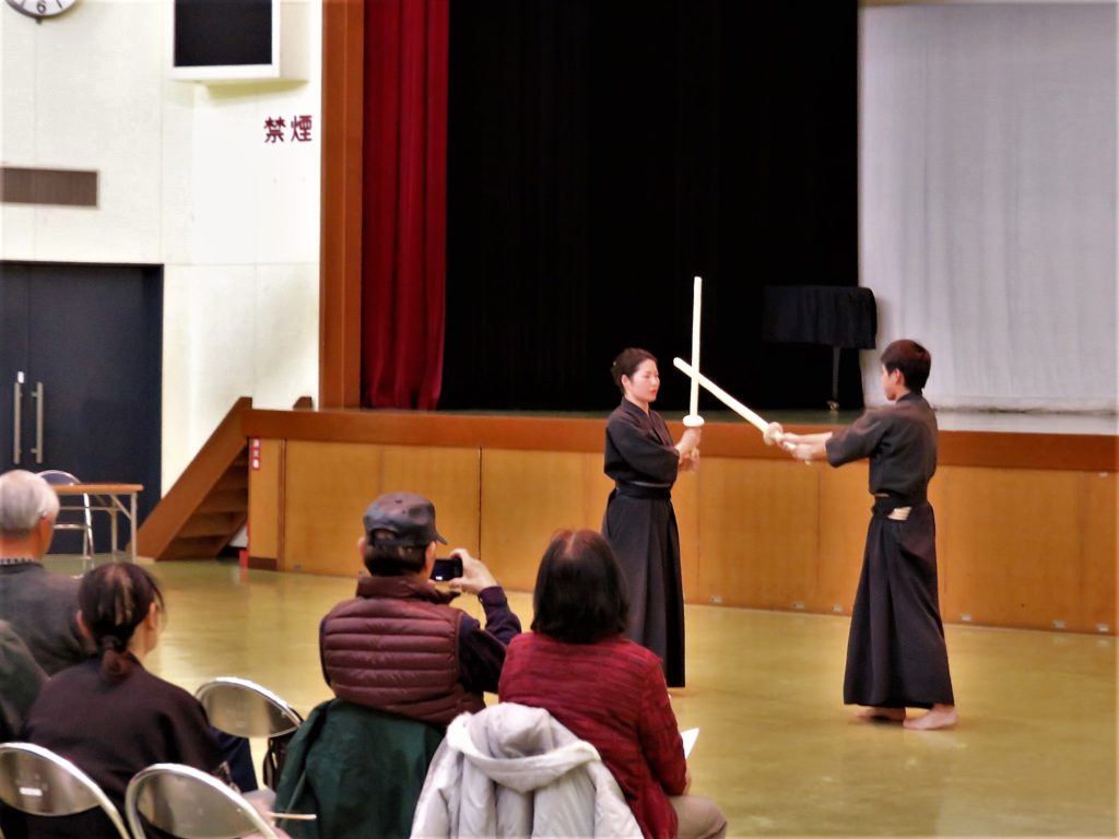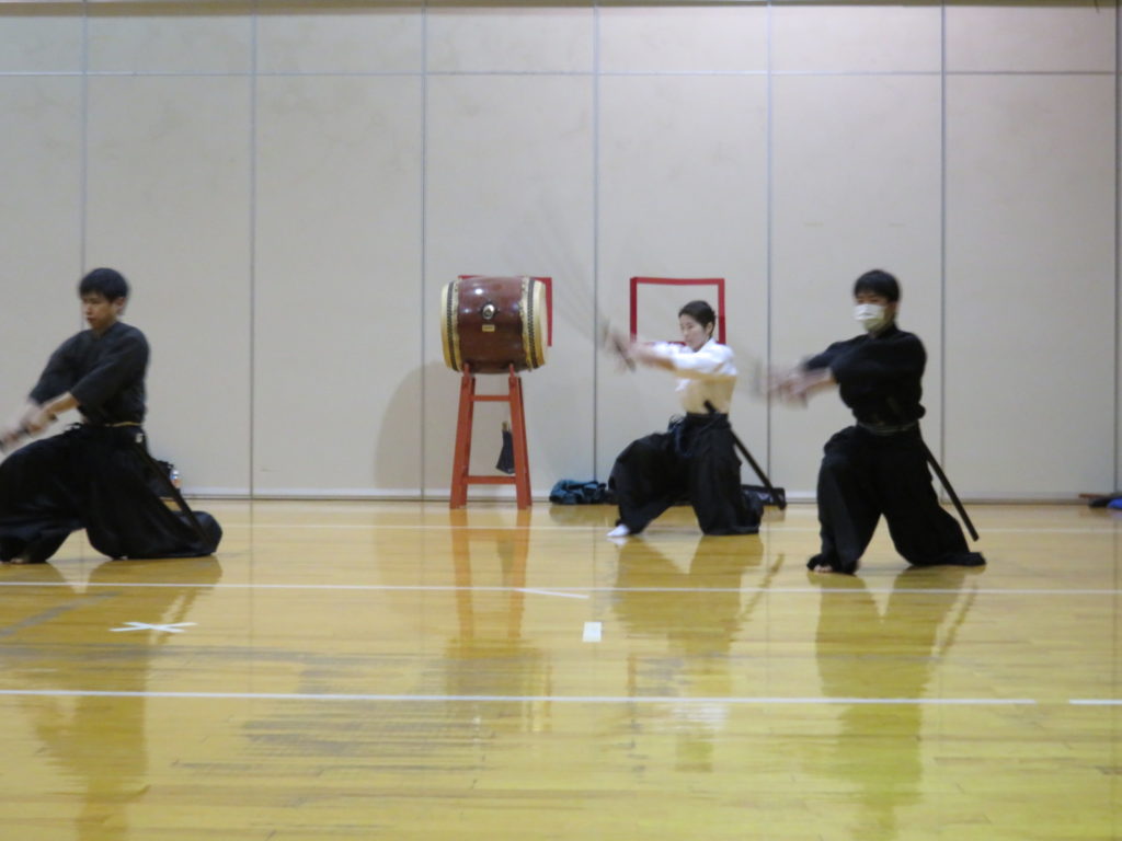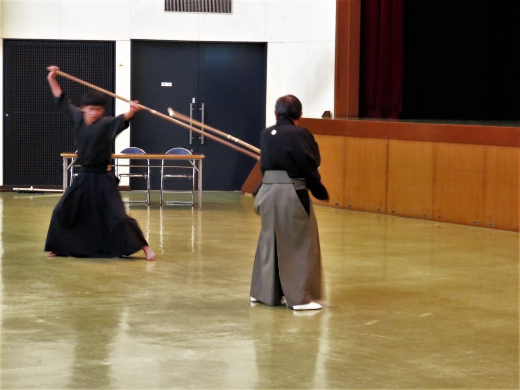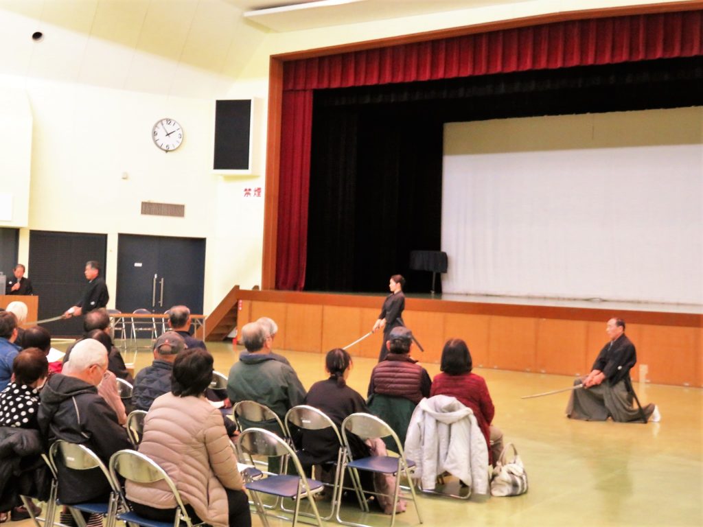 当日は師範と門人の7名で小・中・高の学生の前で居合、剣術、鎗の演武を披露してきました。