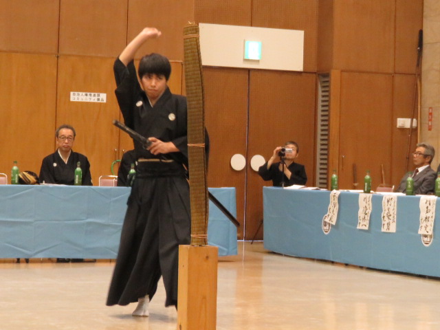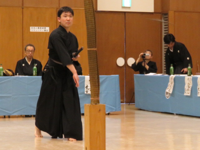 流れとしては演武者の動きに合わせて解説者が解説をしていくという感じで進んでいきます。居合を始めに剣術や長物、イ和(やわら)に試し斬り、最後に伝技が行われました。