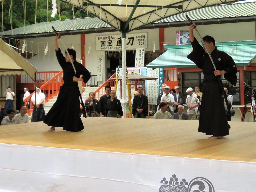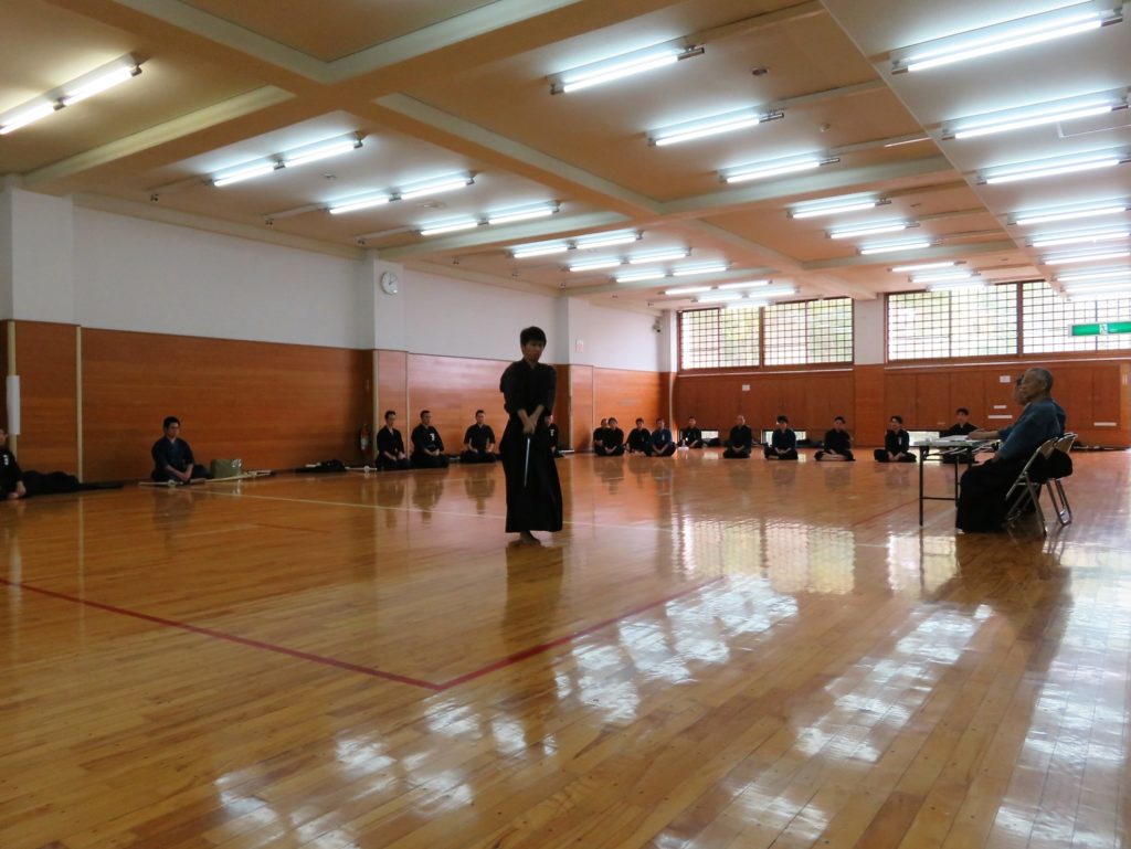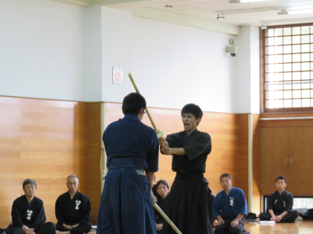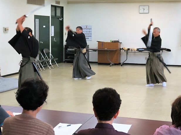 次に居合の基本技を演武し、続いてその居合の実戦的な技を3人で演武します。
